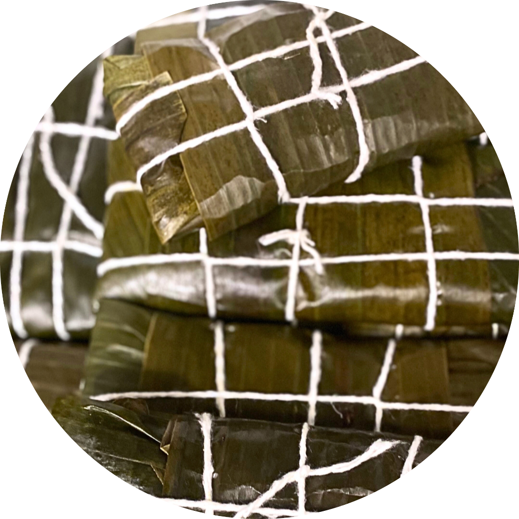 Friand de farine de maïs farci de 3 viandes (porc, poulet et boeuf), légumes, raisins, olives et câpres, cuit à la vapeur dans une feuille de bananier